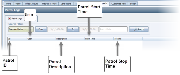 Select the time period for which you want to view patrol logs using the From and To buttons in the Search Filters area and click Search. A line item for each patrol during your selected time period appears in the table.