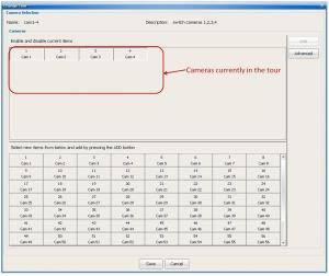 Use the button to add the selected camera(s) to the list of Selected Cameras (the cameras in the tour) or the
