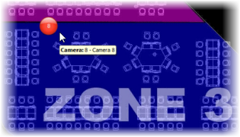 Your maps can be configured with icons representing the cameras set up at your site. This following is a screenshot of a map with numbered, spherical icons representing cameras.