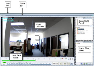 The Secondary Window displays live or recorded video for the currently selected camera. The name of the currently selected view in the Primary Window appears on the Status Bar. The following screenshot shows the Secondary Window, with its four default panels outlined in gray: