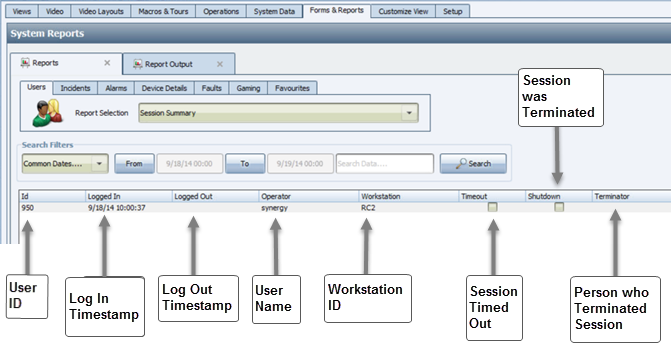 The Session Summary report provides a table of information regarding your Synergy user sessions within a specified time period. The following screenshot shows the columns included in the table.