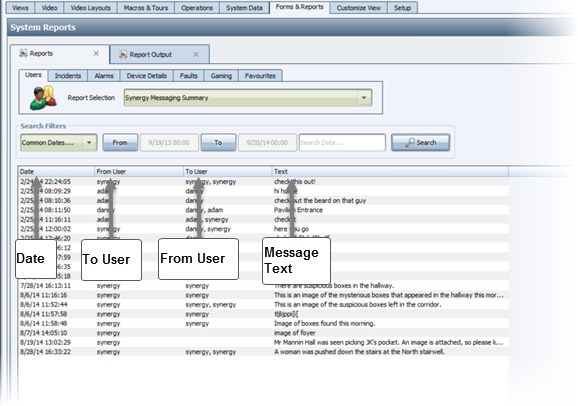 The Synergy Messaging Summary report provides a table of information regarding the messages sent between Synergy users. The following screenshot shows the columns included in the table.
