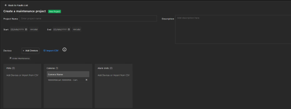 To set up a maintenance project, click New Project from your fault screen. This option is located in the top right of the screen and is only available if the fault relates to a DVR, camera or alarm. When you create a project directly from the faults list, it will automatically populate with the relevant device.