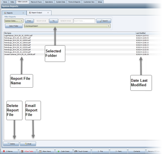 The table on this tab lists all reports saved into the reports folder on your local machine (default of C:\ProgramData\Synectics\Synergy\report). Any report that you save as an HTML, XML, CSV or, PDF file automatically goes into this folder.