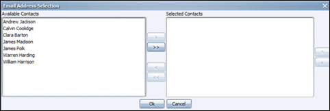 To select the recipient(s) from the Available Contacts list on the left side of the dialog, select them individually and click the single arrow button, or click the double arrow button to select all contacts. You may have contacts organized into a group that appears as a single entry in the Available Contacts list.