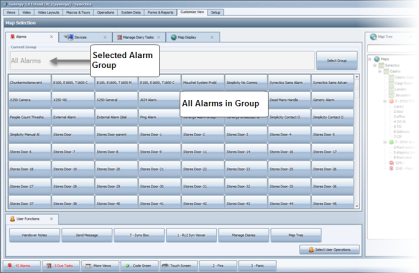 The Alarms tab can also be viewed as a device group page, showing your alarms as buttons arranged in groups. To access the device group page, click the Alarm Buttons button in the Device Selection group on the Customize View menu and drag and drop it to a panel in the Primary Window.