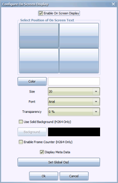 To change the settings, click the On Screen Display button in the Video Configuration group. The Configure On Screen Display dialog appears.
