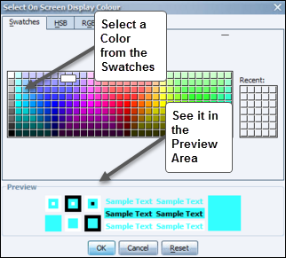 Click the Color button. The Select On Screen Display Colour dialog appears.