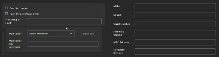 Maintainer allows you to select the person to be assigned to the fault. If you have pre-assigned a maintainer to a specific fault type, this will show by default if the fault type has been configured on this screen. Click Contact Info to see their details. On the Setup Fault Types configuration page, use the Maintainer field to configure this default.