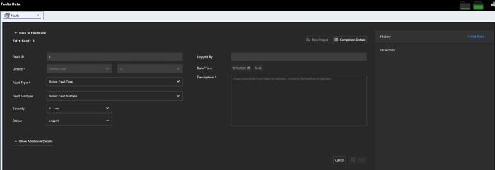 To select a fault for editing, select and double-click on the fault from the list. The fault ID and device information will be pre-populated.