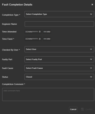 Enter a brief description of how the fault was completed in the Completion Comment field.