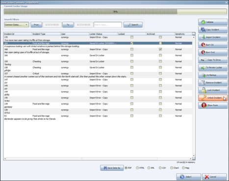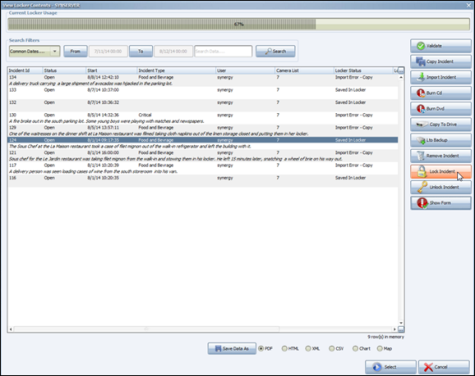 There may be times that you want to lock an incident, especially if it will be used for evidential purposes. A locked incident cannot be edited or deleted. Only users with the proper permission levels can lock incidents and unlock them later. To lock an incident, select it from the list in the View Locker Contents dialog.