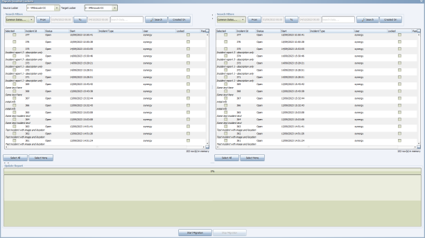 When the lockers are selected, the left hand table shows the incidents currently stored on the source locker. The right hand table shows the incidents currently in the target locker.
