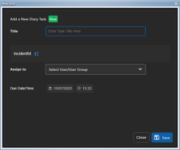 To add a new Duty/Diary Task, select New Duty. The New Duty dialog appears.