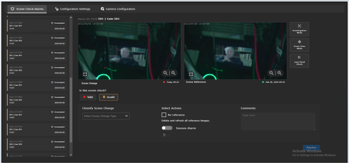 Click any camera alarm on the left-hand side with status Review to display and compare any changes to the reference alarm, which is shown on the right.