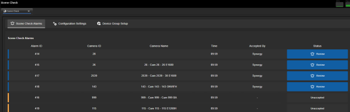 Once configured, a list of the alarms from the available cameras is shown on the Scene Check Alarms page. The status of each alarm is also shown. The currently selected alarm will show as Active. Alarms that have been assigned to an operator but still require action will show with the status Review. Alarms that have not yet been looked at will have the status Unaccepted.