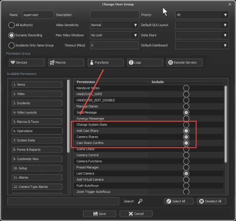 To set up permissions for camera sharing, go to Setup -> System Setup -> Advanced Configuration -> Users -> Setup User Group Permissions.