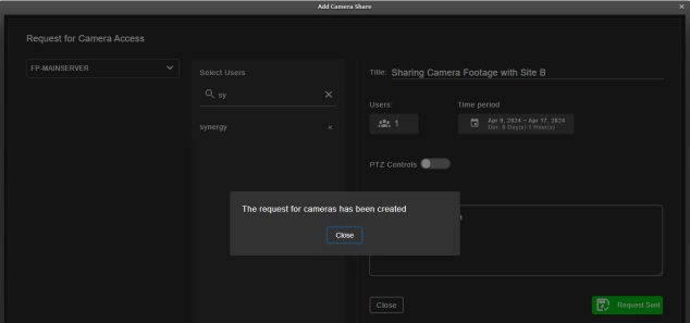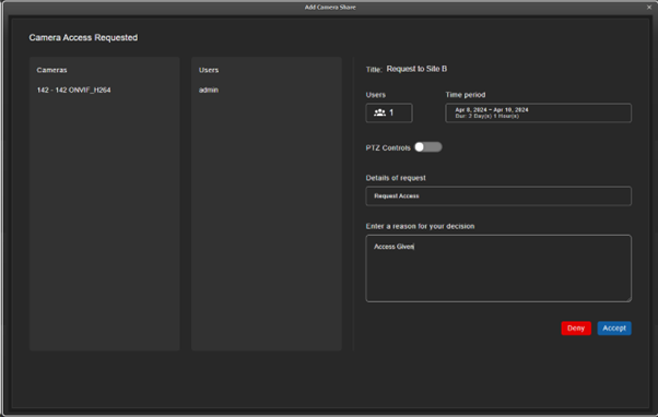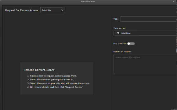 which of their users on site A require access. The username and ID will be automatically added in the requester field when creating a new camera share.