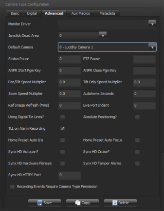 Set up a camera type for the third-party integration and on the Advanced tab, go to Default Camera and add the applicable dummy camera created during the wizard import. The example shown is for a Lucidity integration.
