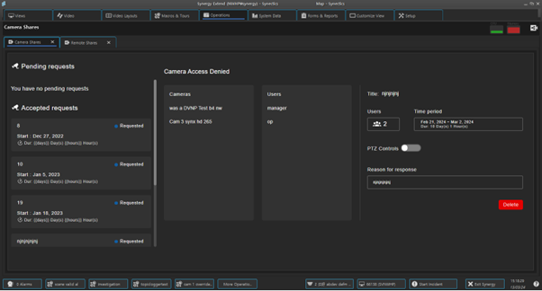 Synergy allows operators to request live camera footage between sites. Footage can be shared between client, display walls, third-party display walls and, if applicable, DVNP servers.