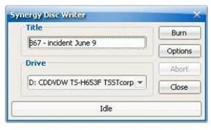 Provided you wish to continue click OK. The files for the disk are prepared and a progress bar is displayed. When this finishes the Synergy Disc Writer dialog is launched: