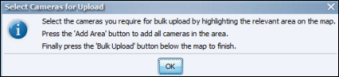 Following the directions on the dialog, drag your cursor to highlight the area on the map that you want to cover in the bulk upload. All cameras within this defined area will be included in the bulk upload with the same timestamp.