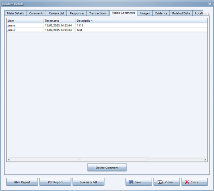 The comment is now saved to the incident and appears in the Video Comments tab.