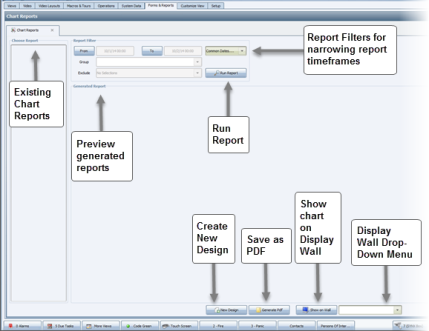 The Chart Reports tab allows you to create and save customized reports in chart formats, which you can then quickly run as required. To access this tab, click the Chart Reports button in the System Forms group on the Forms & Reports menu.