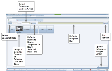This tab shows thumbnail images of selected cameras at selected dates and times. The thumbnails include the camera ID and name and the date and time the image was recorded. If there are no snapshots, Synergy will automatically create a reference image. You also have the option to update your reference images to these images.
