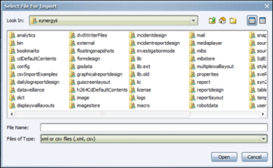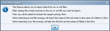 The dialog explains that data that you import must be in the .csv or .xml file format and depending upon your file format choice, how the form fields will be named. Click OK. The Select File For Import dialog appears.