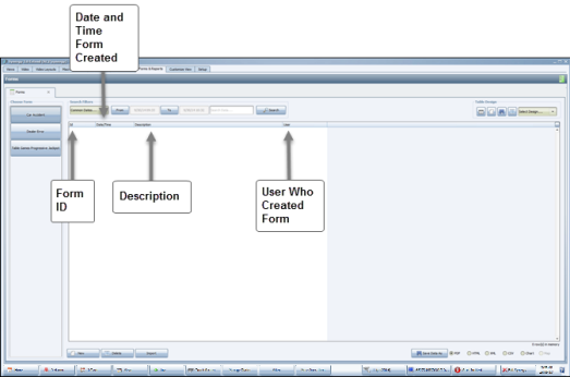 The Forms tab is a database where you can access all forms created in the system and where you can edit form templates to create new forms. Click the Forms button on the System Forms group on the Forms & Reports menu. The following screenshot shows the columns included in the table.