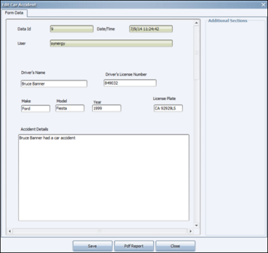 Enter information in the Form Data fields and click Save to create the report entry. If you want to create a PDF file of the report, click the Pdf Report button at the bottom of the dialog.