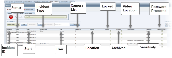 The Incident Summary report provides a table with details about all incidents, as entered on their corresponding Incident Details dialogs. The following screenshot shows some of the columns included in the table. If you are using a user-defined form for an incident, any fields that are defined in that form will also be shown here.
