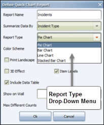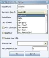 A useful format for an Incident Summary is a chart. To generate the Incident Summary in chart format, select the Chart radio button and click the Save Data As button. The Define Quick Chart Report dialog appears.