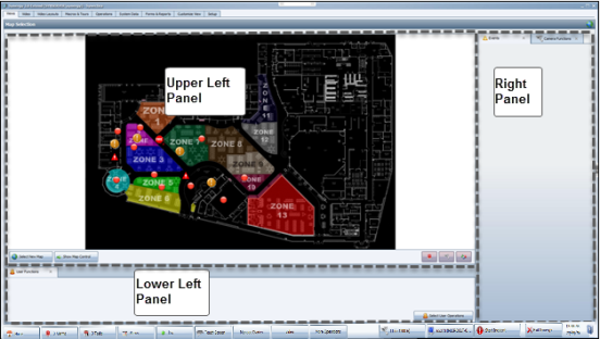 The window consists of up to six panels , depending upon the workspace view in which you are working. The screenshot below shows the three panels in the default Map Selection view: the upper left panel, the lower left panel, and the right panel, outlined in grey.